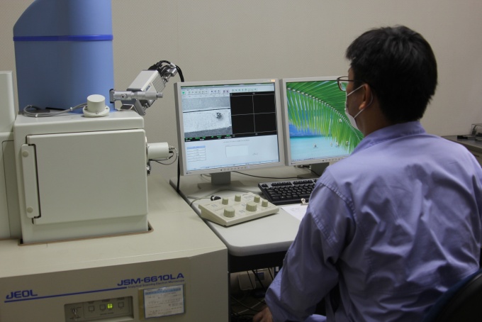 写真は、エネルギー分散型X線分析装置付き走査電子顕微鏡を操作中の私です。