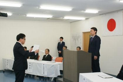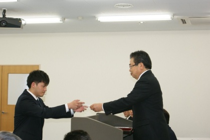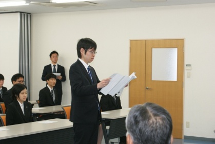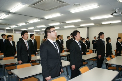 新入社員一同、緊張した面持ちで式に臨んでいました。採用辞令を受け取った後、新入社員代表による決意表明が行われ、無事入社式を終えました。
